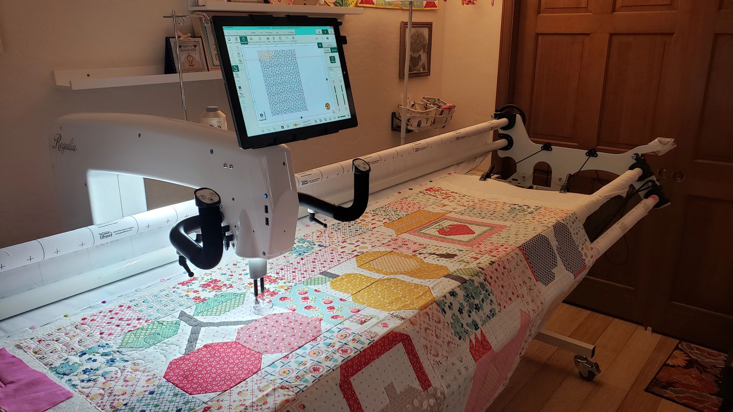 I provide edge to edge and custom computerized block quilting using a Babylock Regalia and the ProStitcher Software.
